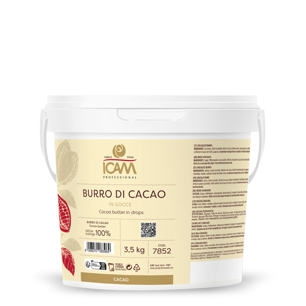 Cocoa butter from first pressing, obtained by pressing top quality cocoa and then deodorising it. It is a noble vegetable fat with no cholesterol. Maximum acidity 1.5%