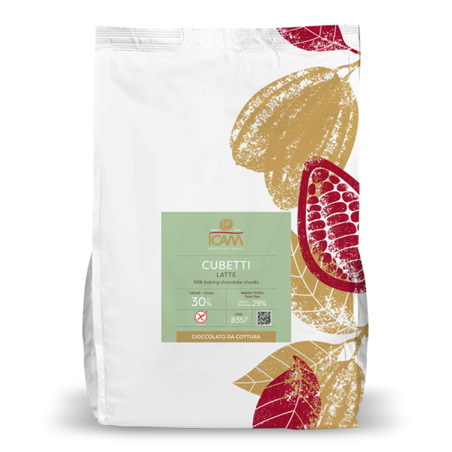 Chocolate with nice organoleptic characteristics, designed to resist high temperatures when baking, presented in an irregular cube form, created for oven-based products.