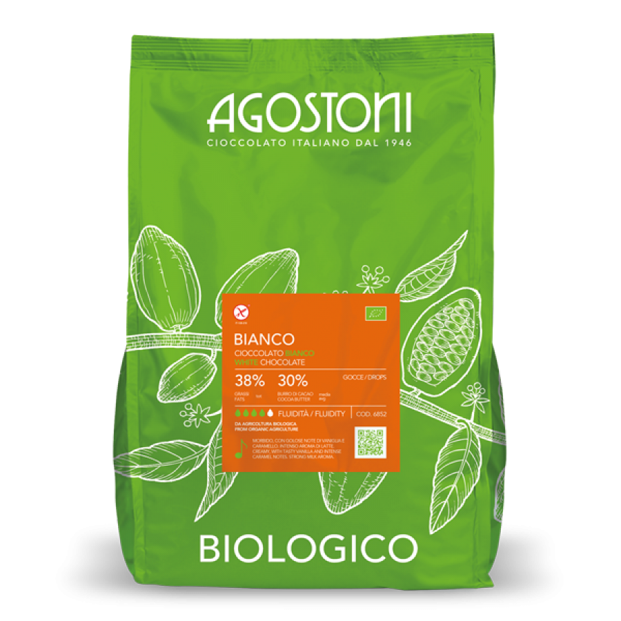 White chocolate of excellent quality, both for the use of ingredients selected from organic farming, and for the exceptionally rich recipe. Great personality, characterised by the high presence of whole milk from organic farming and the irresistible aroma of natural vanilla coming from organic agriculture of Madagascar, visibly perceptible in powder form.