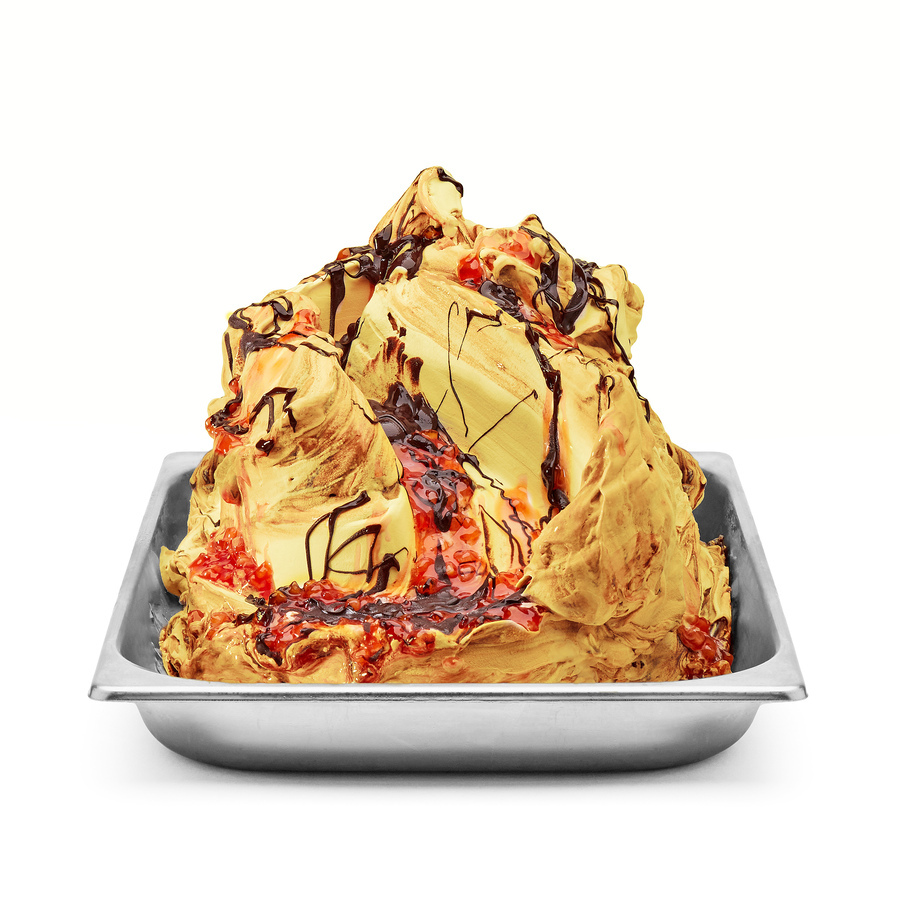 Gebruikt de Orange Variegato als variegato en decoratie. Decoreer de ijsbak met de Copertura Excellence en maak de bak af met stukjes sinaasappel en enkele kaneelstokjes.