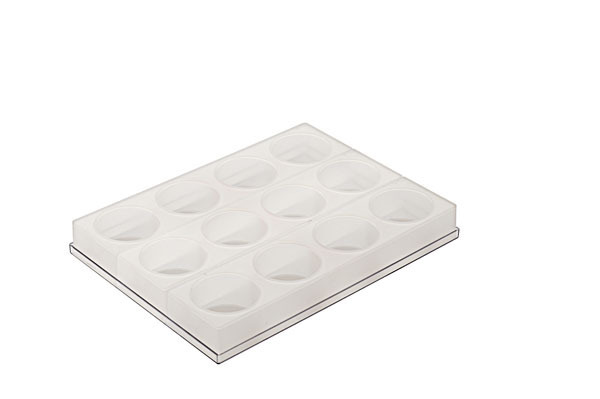 Een set van 3 mallen met elk 5 cylindrische vormen met een doorsnee van 85mm en een diepte van 45mm.