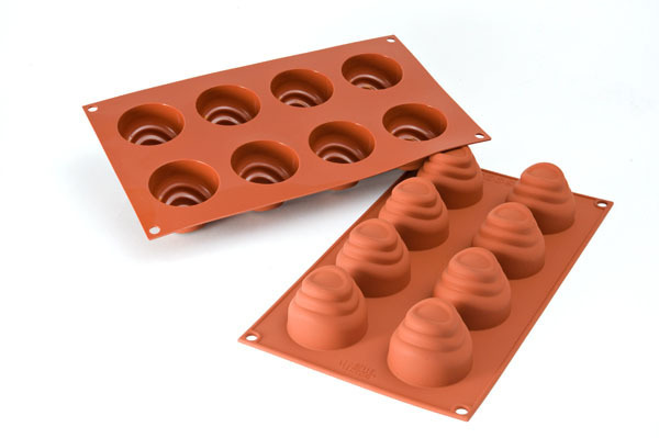 Een siliconen matje met daarin 8 vormpjes met een doorsnee van 55mm, een diepte van 42,5mm en een inhoud van 70ml.