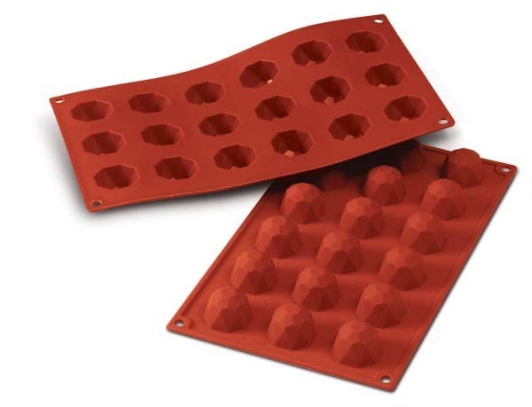 Een siliconen matje met daarin 18 diamantvormpjes met elk een doorsnee van 35mm, een diepte van 23mm en een inhoud van 20ml.
