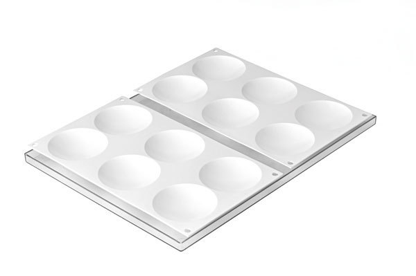 Siliconen mal met daarin 6 ronde vormen met een doorsnede van 80 mm en een diepte (in het midden) van 20 mm.