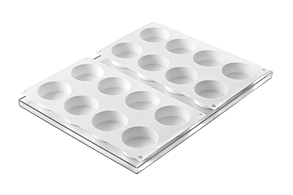 Set van 2 silicone mallen met daarin elk 8 ronde vormen met een doorsnede van 63 mm en een hoogte van 22 mm.